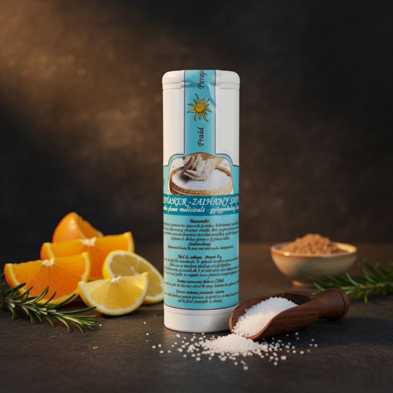 Ingrediente: sodium chlorid (sare gemă), vegetable oils (amestec de uleiuri esentiale din plante medicinale: rozmarin- Aetherolum rosmarini, portocala- Aetherolum aurantii, melisa- Aetherolum melissa officinalis).